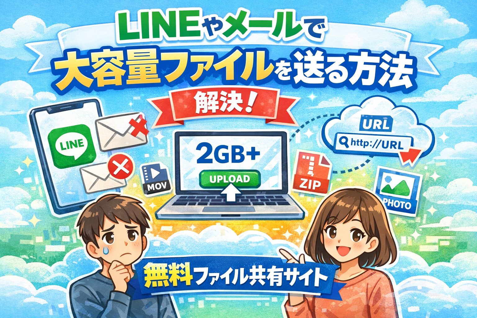 LINEやメールで大容量ファイルが送れない場合は、ファイル共有サイトを使うと簡単に解決できます。