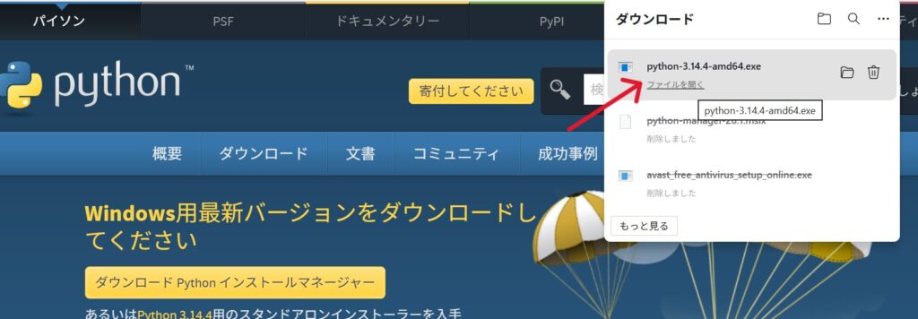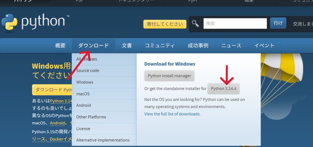 画像のようにダウンロードにカーソルを合わせ→のDownload Python 3.xx.x