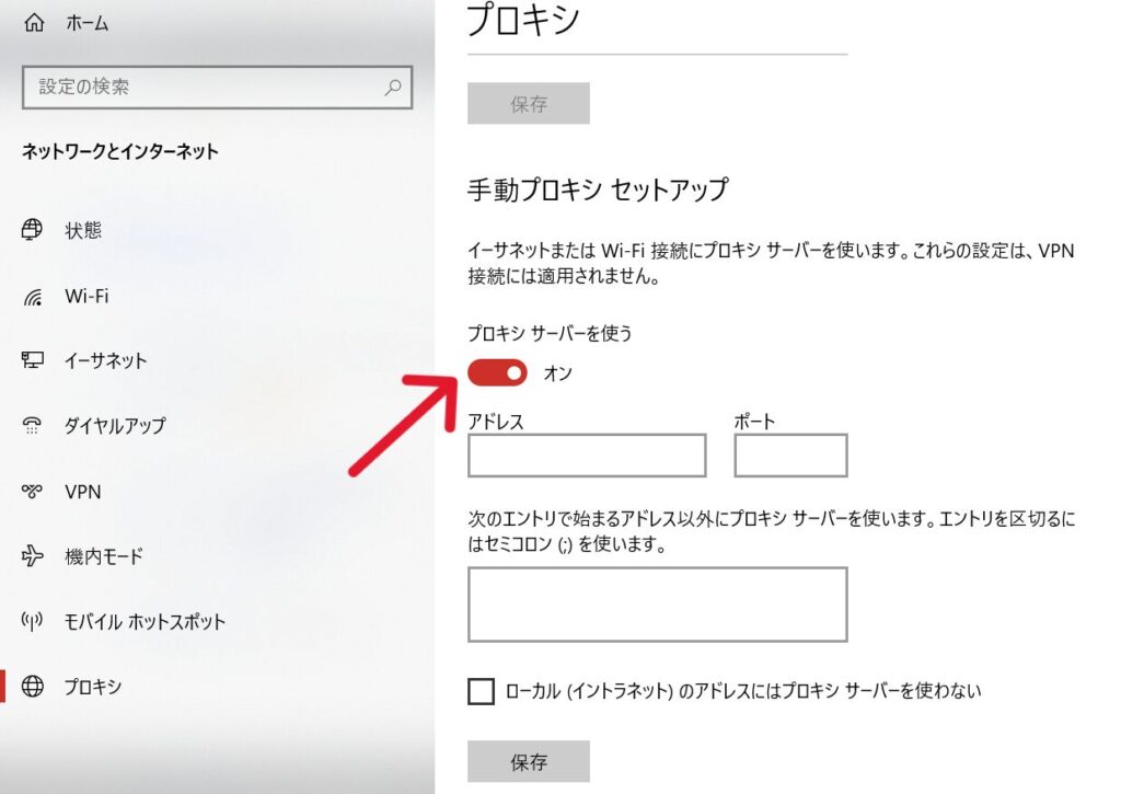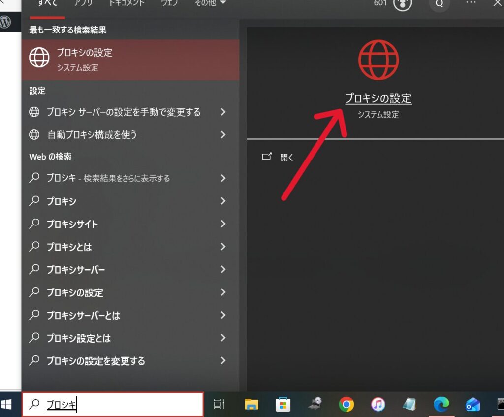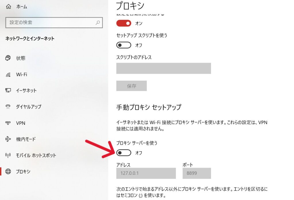 - 「パソコンのプロキシ設定を開く」をクリックすると「プロキシ設定画面」が開きます👇
